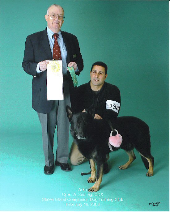of German Shepherd show dogs. Arko is primarily black with